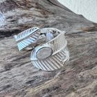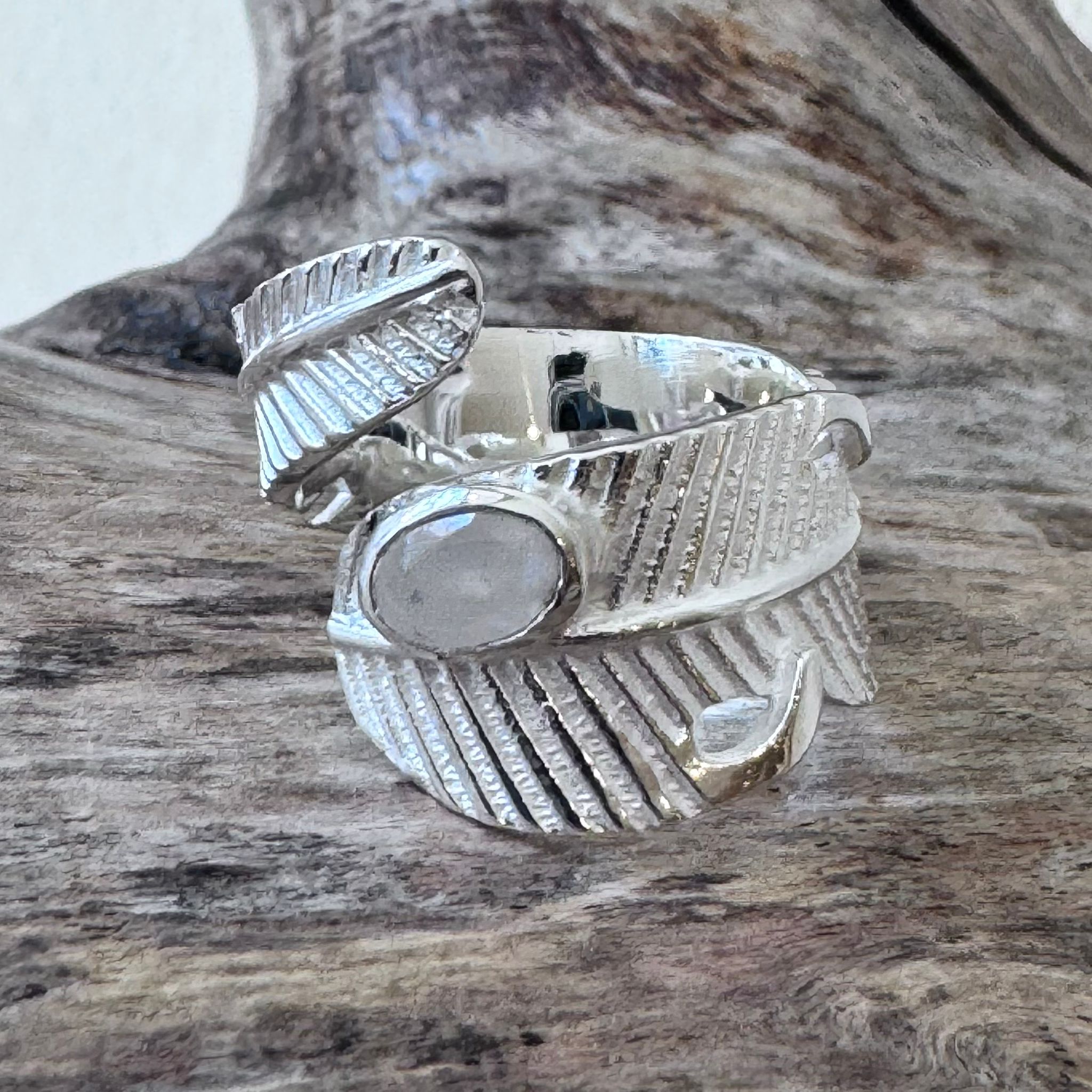 Sehr schöner Ring in Form einer Feder aus mattiertem, teilweise poliertem Sterlingsilber und einem facettiertem Regenbogen-Mondstein (7x4,5mm). Die Ringschiene hat eine Breite von 6mm bis 13mm.