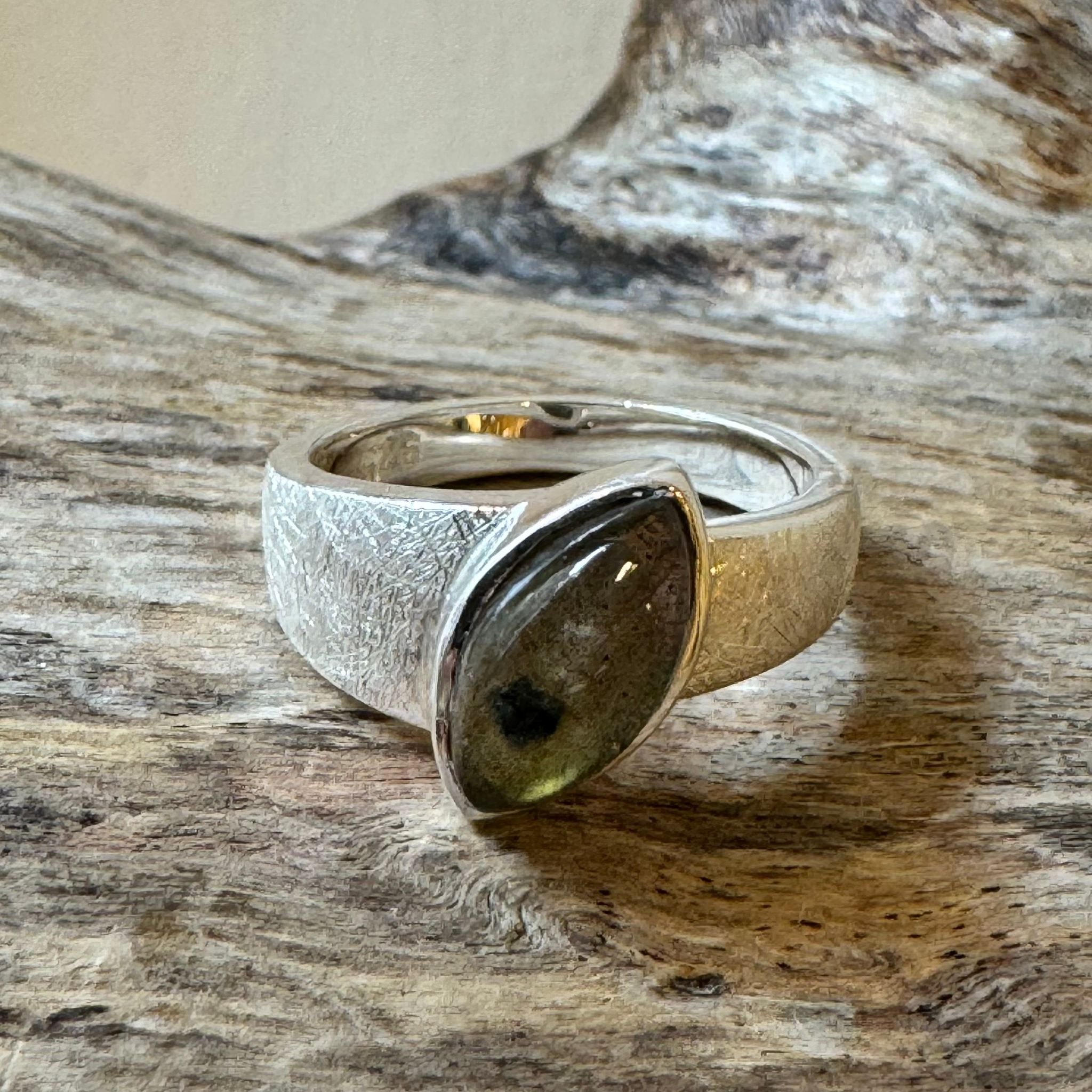 Schöner Ring aus mattiertem Sterlingsilber und einem poliertem Labradorit in Marquisenform (14x7mm). Die Ringschiene hat eine Breite von 2,5-9mm.