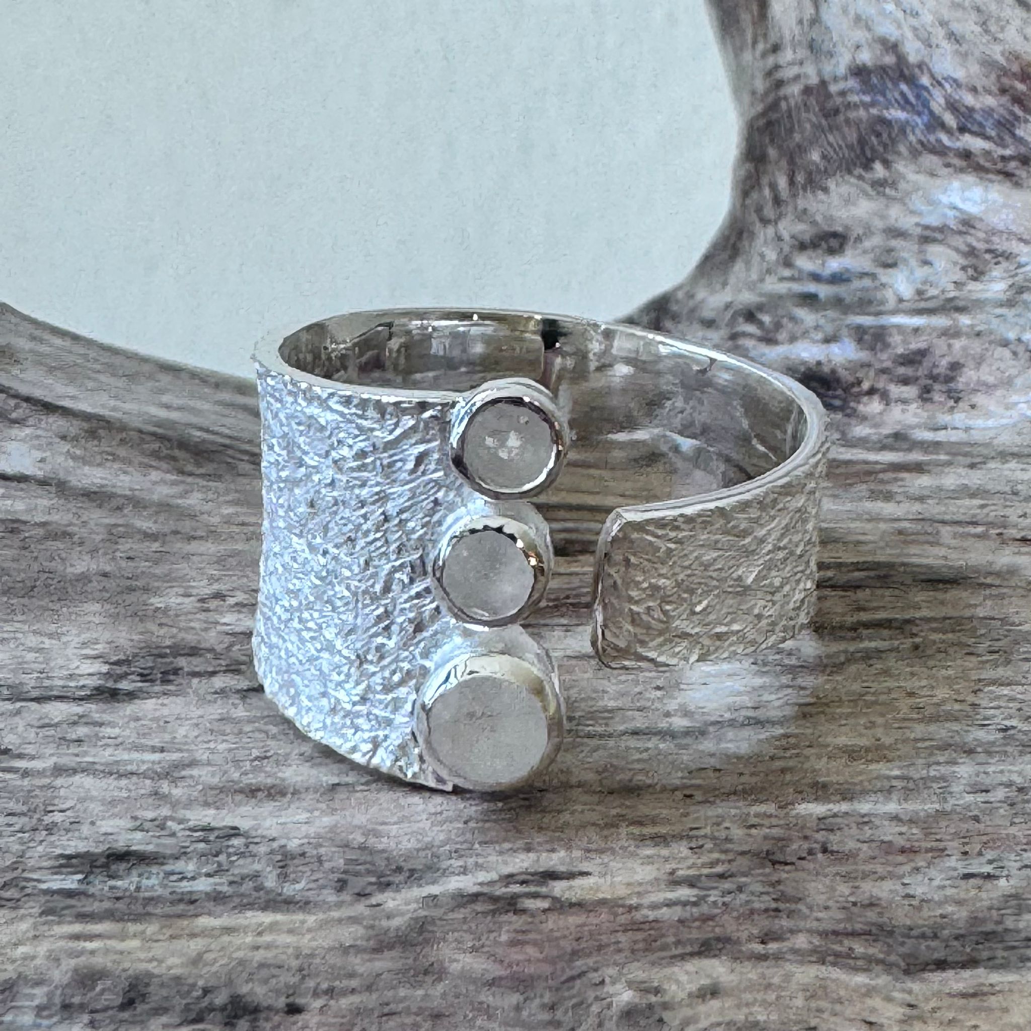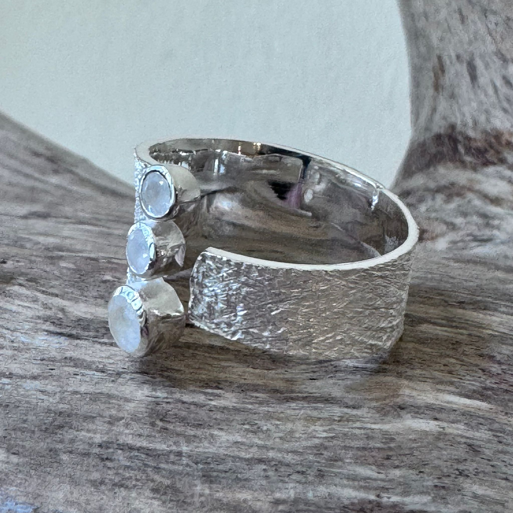 Schöner Ring aus mattiertem Sterlingsilber und drei facettierten Regenbogen-Mondsteinen (5mm und 3,5mm). Die Ringschiene ist oben geöffnet und somit lässt sich die Grösse leicht anpassen. Der Ringschiene hat eine Breite von 7mm bis 15mm.
