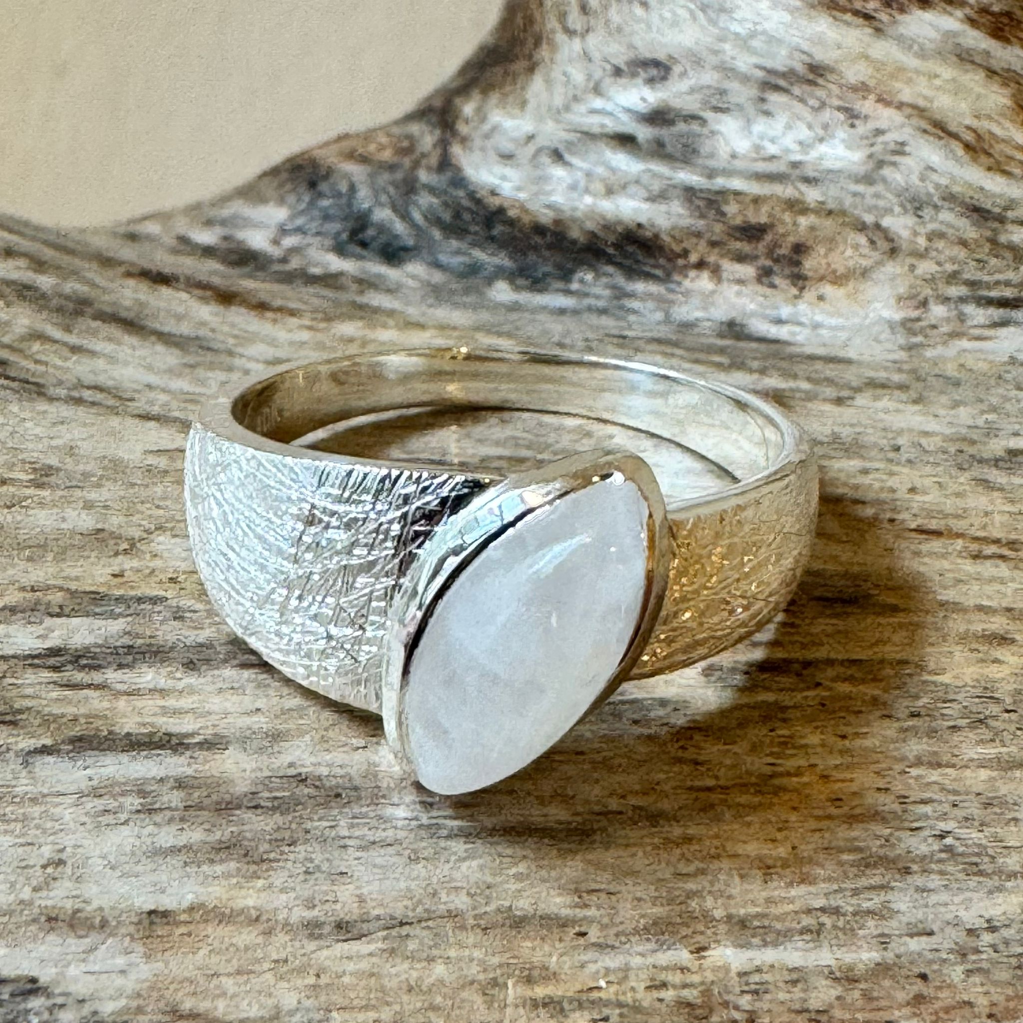 Schöner Ring aus mattiertem Sterlingsilber und einem poliertem Regenbogen-Mondstein in Marquisenform (14x7mm). Die Ringschiene hat eine Breite von 2,5-9mm.