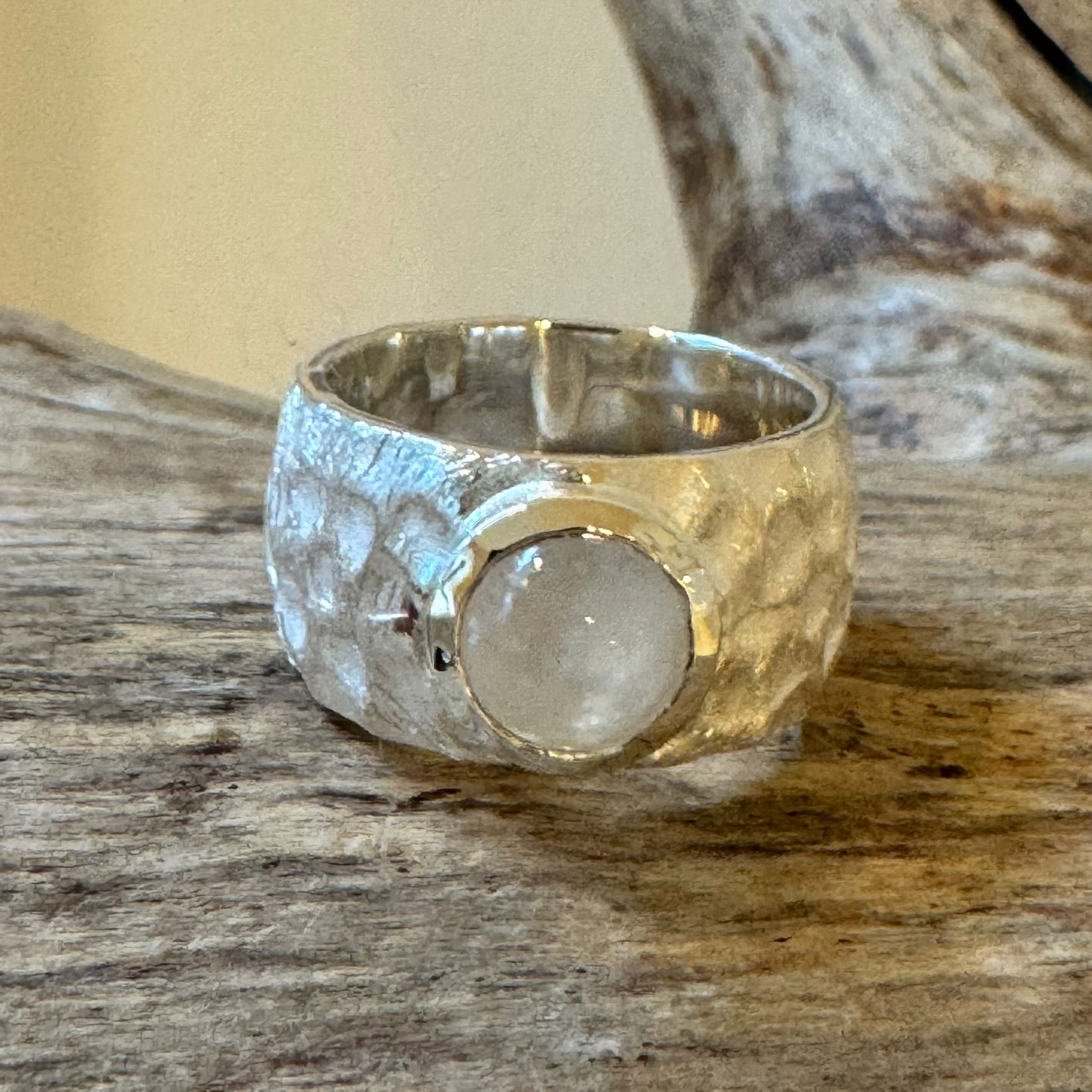 Schöner Ring aus mattiertem Sterlingsilber und einem Regenbogen-Mondstein Cabochon (8mm). Die Ringschiene hat eine Breite von 11mm.