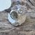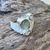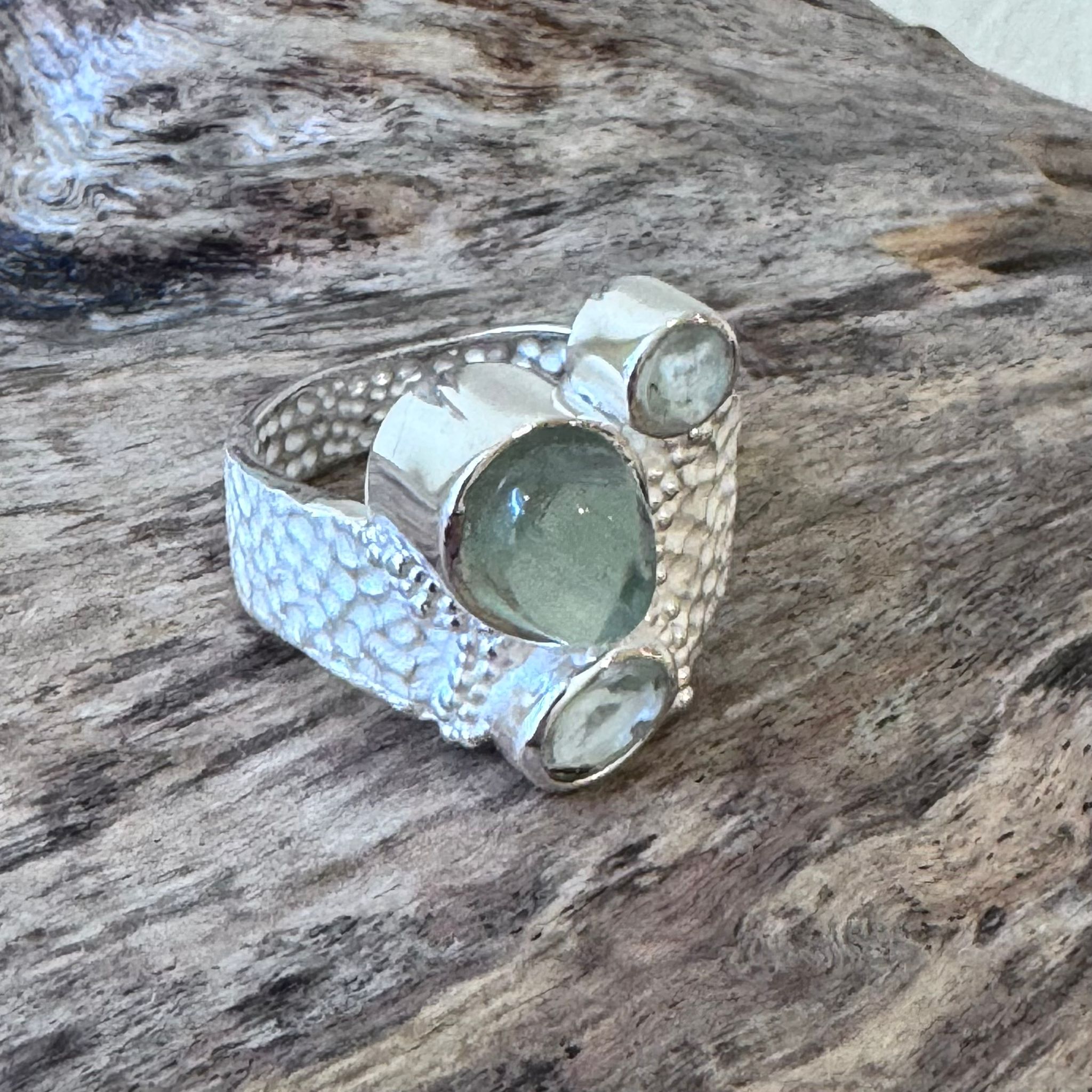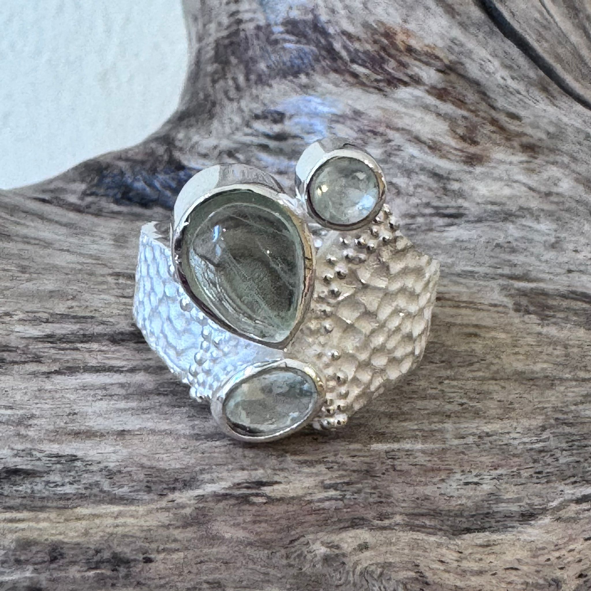 Sehr schöner Ring aus mattiertem und teilweise poliertem Sterlingsilber mit 1 tropfenförmigem poliertem Fluoritstein (12x8mm) und zwei facettierten Fluoritsteinen (4,5mm und 8x5mm). Oben hat der Ring eine Breiten von 21mm und unten ist die Ringschiene 6mm breit.