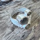 Sehr schöner Ring aus mattiertem und teilweise poliertem Sterlingsilber mit 1 tropfenförmigem poliertem Labradorit (12x8mm) und zwei facettierten Labradoritsteinen (4,5mm und 8x5mm). Oben hat der Ring eine Breiten von 21mm und unten ist die Ringschiene 6mm breit.