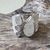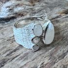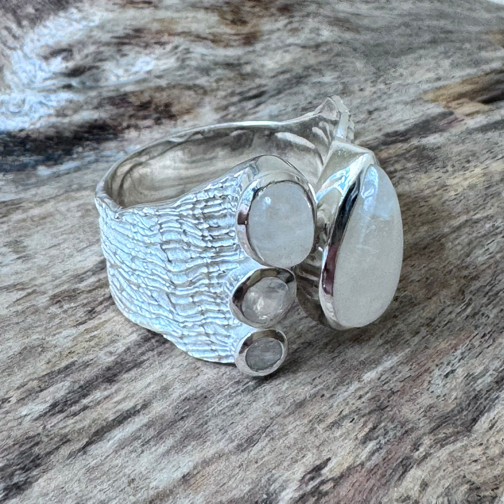 Sehr schöner Ring aus mattiertem und teilweise poliertem Sterlingsilber mit einem poliertem Regenbogen-Mondstein in Tropfenform (16x9mm), einem poliertem Regenbogen-Mondstein (7x5mm) und facettiertem Regenbogen-Monstein (3mm und 4mm). Der Ring ist oben geöffnet und die Grösse kann so leicht verändert werden. Die Ring hat oben eine Breite von 19mm und unten ist die Ringschiene 7mm breit.