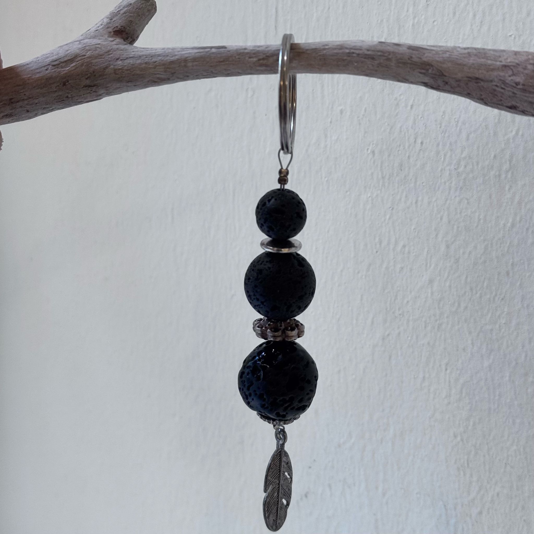 Diesen schönen Schlüsselanhänger haben wir aus Lavakugeln (10mm, 15mm und 17mm) und Zwischenstücken und einer Feder aus Metall kreiert. Der Schlüsselanhänger hat eine Länge von 12,4cm. Der Schlüsselring aus Metall hat einen Durchmesser von 29mm.
