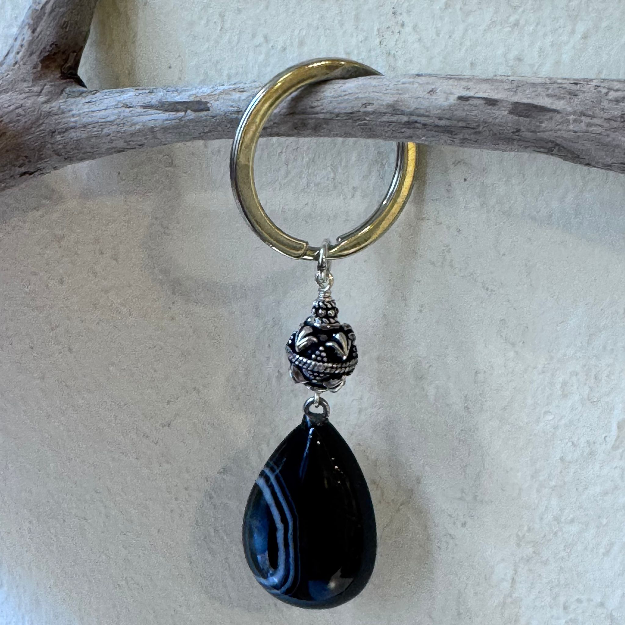 Diesen schönen Schlüsselanhänger haben wir aus einem Element aus oxidiertem Sterlingsilber (10mm) und einem Achat in Tropfenform (20x21mm) kreiert. Der Anhänger hat eine Länge von 8,2cm. Der Schlüsselring aus Metall hat einen Durchmesser von 29mm.