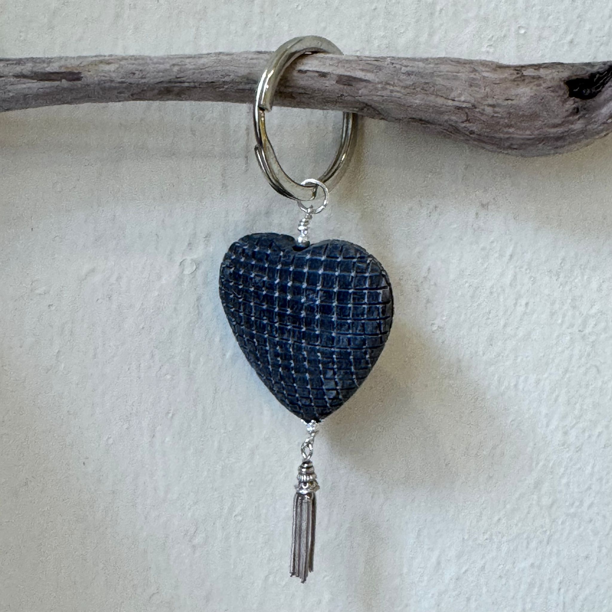 Diesen schönen Schlüsselanhänger haben wir aus einem Herz aus mattiertem Wasserbüffelhorn (35mm), Zwischenstücken aus Sterlingsilber und einer Quaste aus Sterlingsilber (26x6mm) kreiert. Der Schlüsselanhänger hat eine Länge von 10cm. Der Schlüsselring aus Metall hat einen Durchmesser aus 29mm.